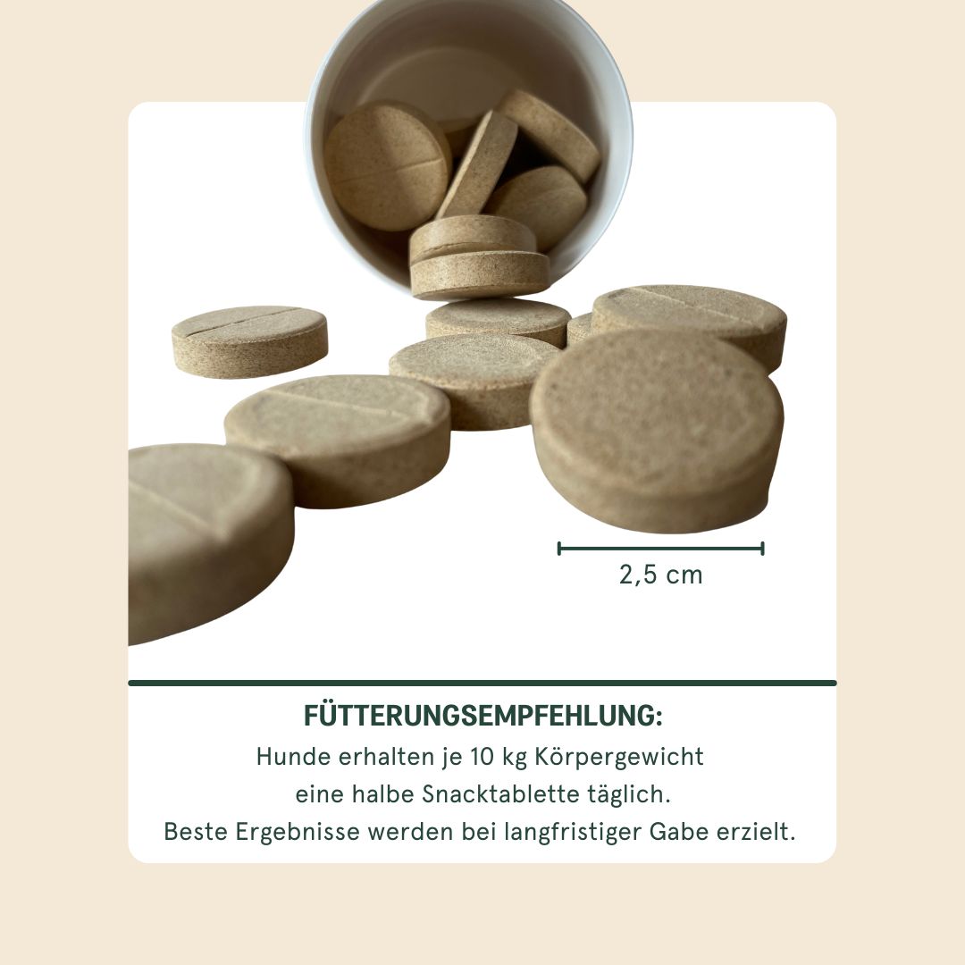 Wann eine Wirkung bei deinem Hund festzustellen ist, hängt vom allgemeinen Gesundheitszustand, den gesundheitlichen Bedürfnissen deines Hundes ab und davon, wie sich dein Hund an die Snacktabletten gewöhnt.