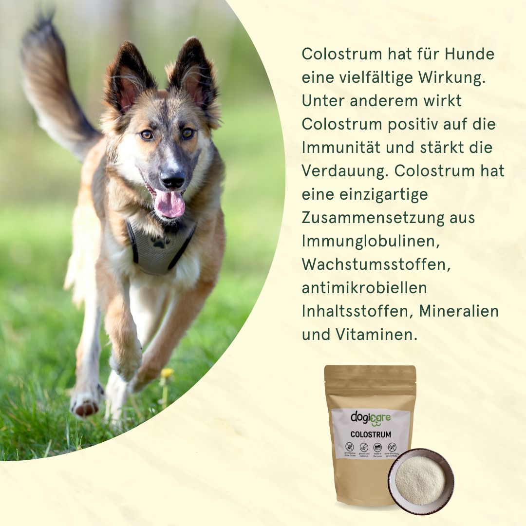 Unser Colostrumpulver besteht aus ein 100% Colostrum, welches als Naturprodukt für alle Hunde Monaten geeignet ist, um Immunität, Verdauung und Stoffwechsel zu unterstützen.