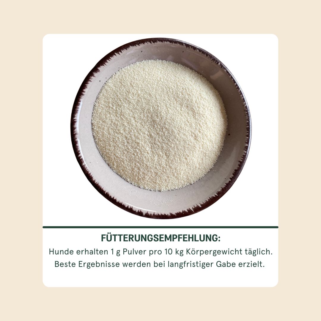 Hunde erhalten 1 g Pulver pro 10 kg Körpergewicht täglich.