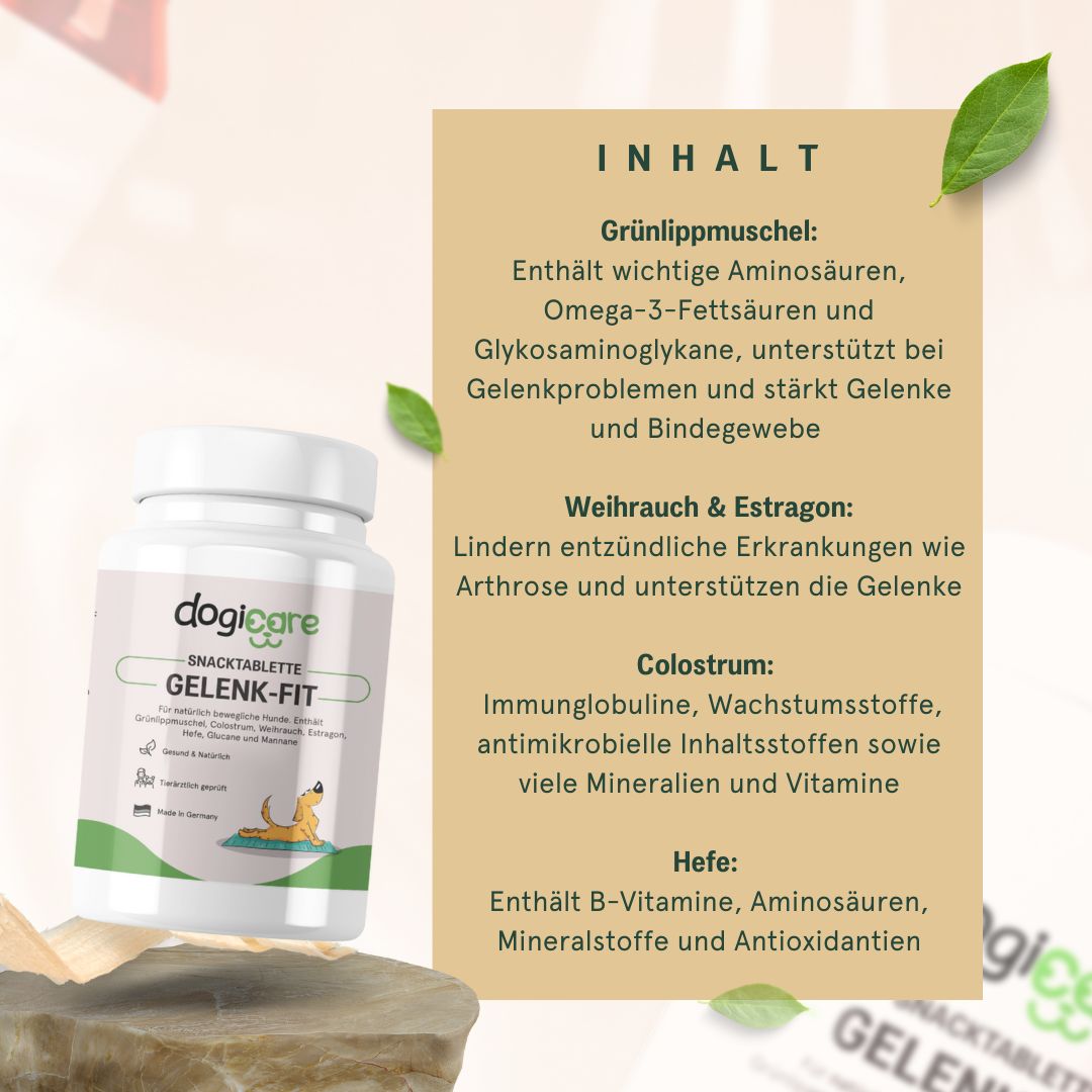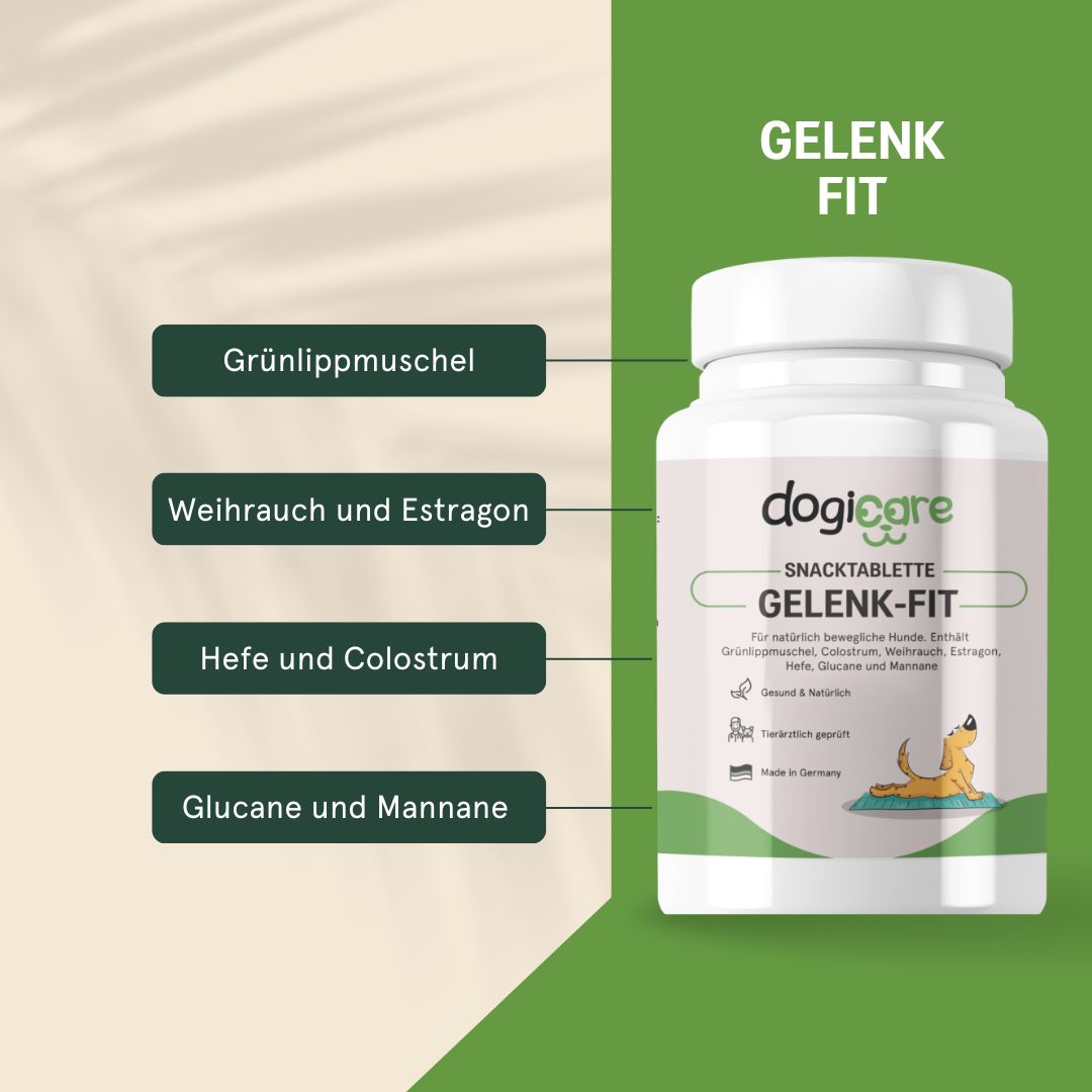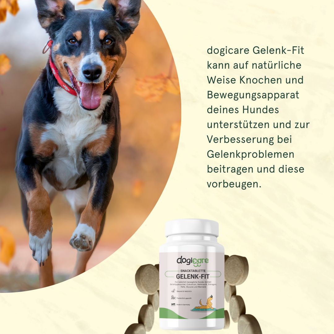 dogicare Gelenk-Fit kann auf natürliche Weise Knochen und Bewegungsapparat deines Hundes unterstützen.
