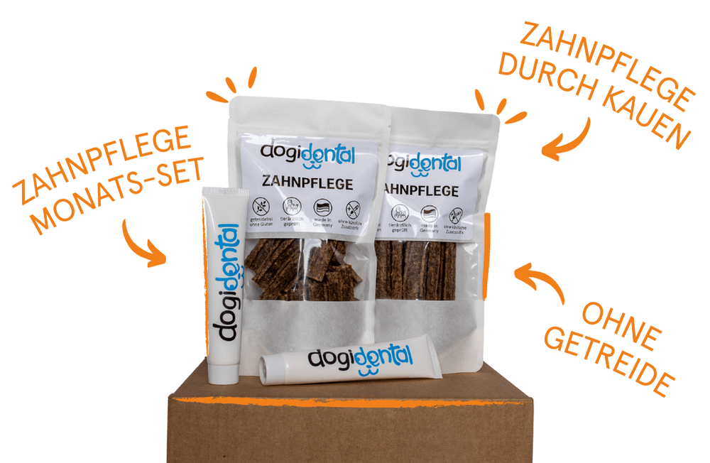 Das Dental Zahnpflege-Set enthält einen Monatsvorrat an einzigartigen Kausticks und enzymhaltiger Zahpasta für effektive Zahnpflege durch Kauen.