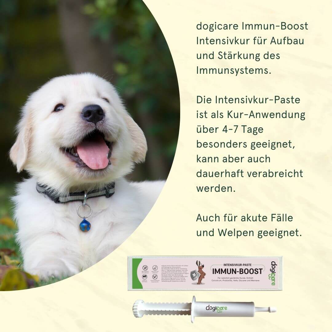 Jüngere Hunde im Welpenalter können unsere Immun-Boost Intensivkur-Paste verwenden.