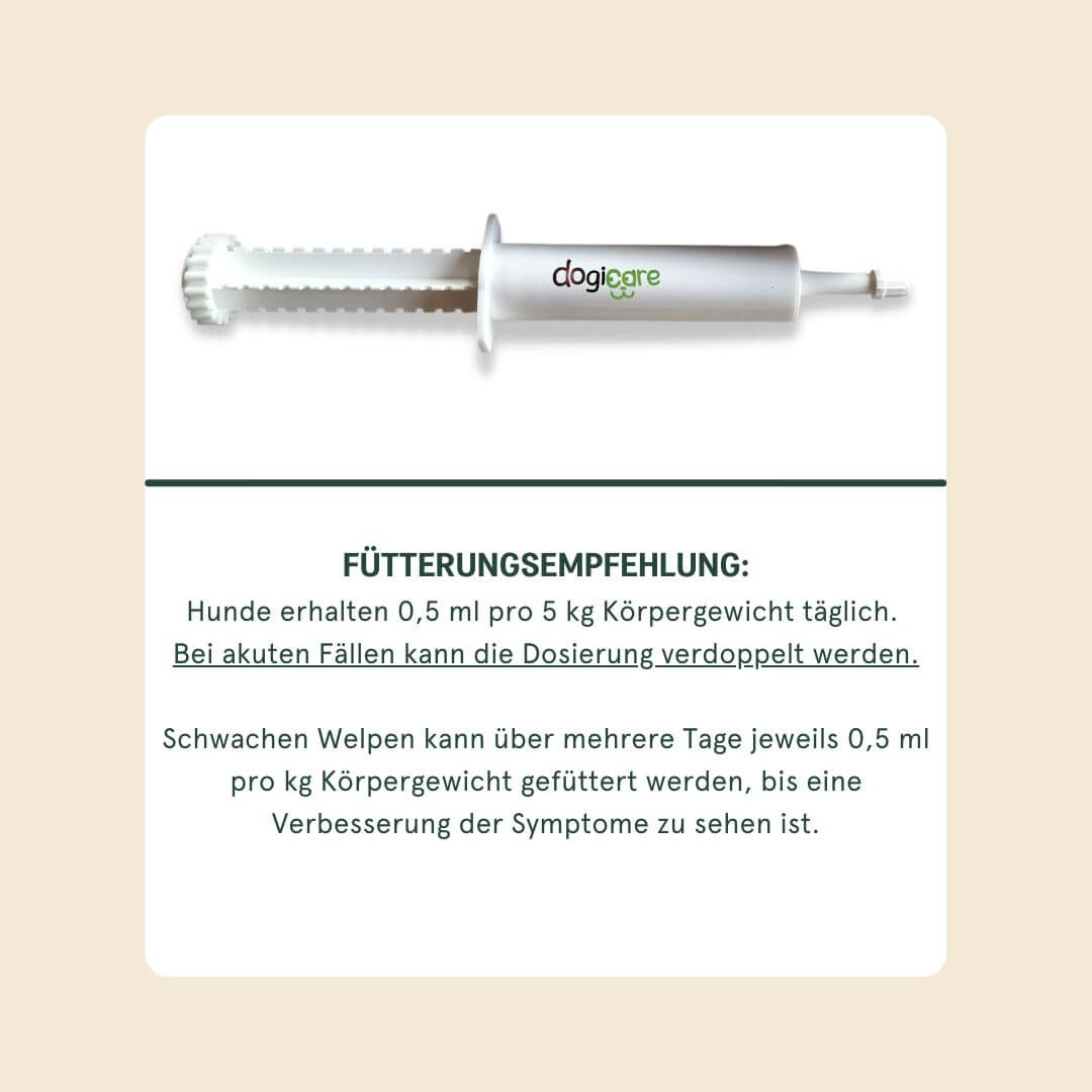 Schwachen Welpen kann über mehrere Tage jeweils 0,5 ml pro kg Körpergewicht gefüttert werden, bis eine Verbesserung der Symptome zu sehen ist.